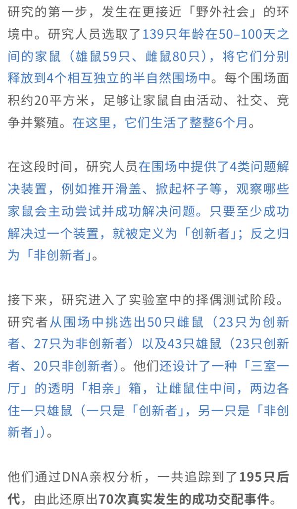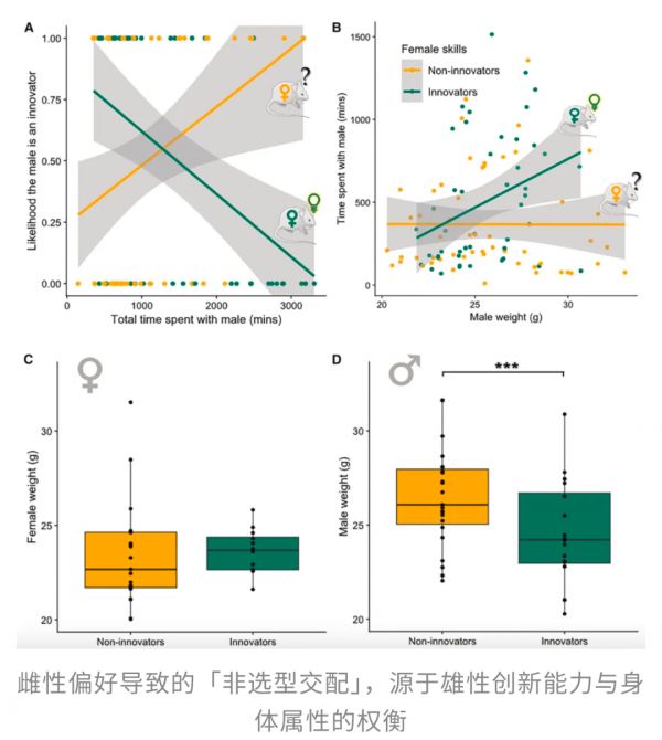 而那些创新能力较弱的雌鼠,更青睐创新能力较强的雄鼠,对对方的体型倒没那么在意,能补齐自己「动脑」能力的缺口就够了。
