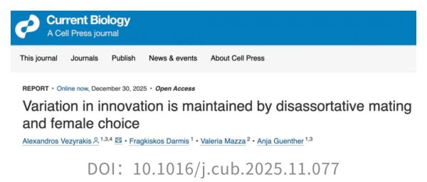[1]Vezyrakis A, Darmis F, Mazza V, Guenther A. Variation in innovation is maintained by disassortative mating and female choice. Curr Biol. 2025 Dec 30:S0960-9822(25)01618-5. doi: 10.1016/j.cub.2025.11.077. Epub ahead of print. PMID: 41475342.