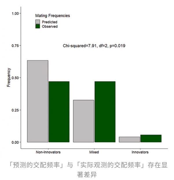 研究者认为,如果家鼠在择偶时完全「随缘」,不考虑彼此是否具备创新能力,那么按照统计学的随机模型推算,「创新者×非创新者」这样的组合,理论上大约只会占到33%。