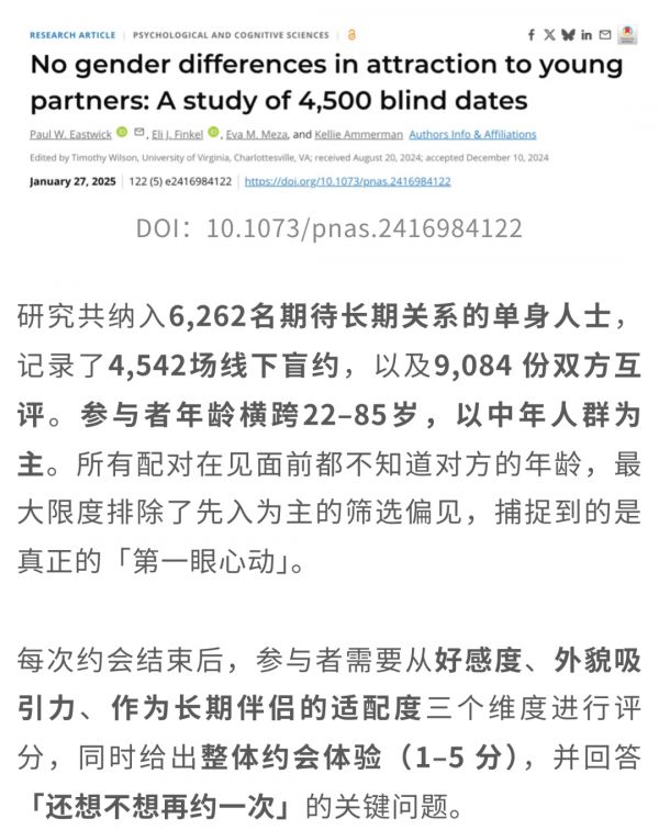 [2]Eastwick PW, Finkel EJ, Meza EM, Ammerman K. No gender differences in attraction to young partners: A study of 4500 blind dates. Proc Natl Acad Sci U S A. 2025 Feb 4;122(5):e2416984122. doi: 10.1073/pnas.2416984122. Epub 2025 Jan 27. PMID: 39869809; PMCID: PMC11804577.撰文 | 木白