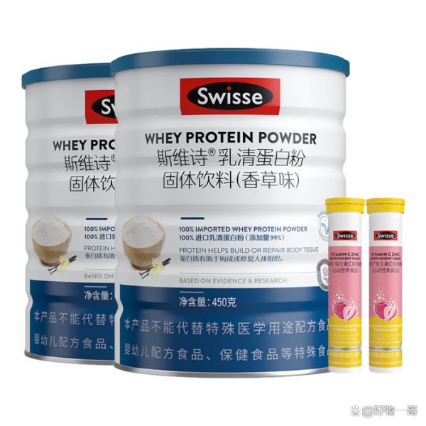 Swisse的这款乳清蛋白粉,是蓝帽认证产品,在增强免疫力方面有明确的保健功能。它的配方里除了乳清蛋白,还添加了免疫球蛋白和乳铁蛋白,可以说是针对免疫支持做了强化。一套是两罐450g的蛋白粉,还配了维C片,组合起来更侧重日常免疫维护。