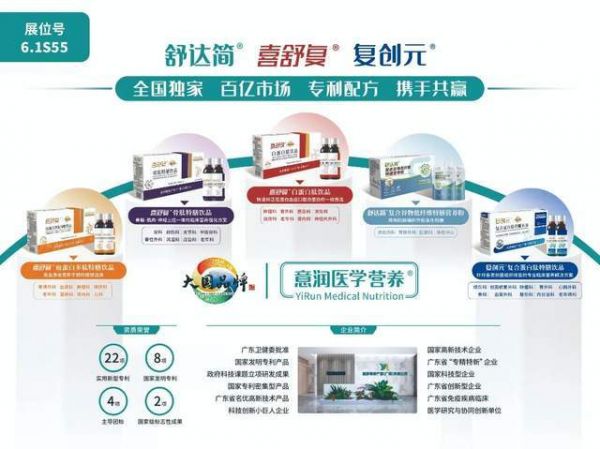 届时,意润健康产业(广州)有限公司将携原研出品的喜舒复®白蛋白肽饮品、骨肽特膳饮品、血蛋白多肽特膳饮品,复创元®复合蛋白肽特膳饮品,舒达简®复合谷物低纤维特膳营养粉系列医学营养食品参展!特此向各界专家学者、合作伙伴、行业同仁发出诚挚邀请,意润健康期待与您在本届CMEF主展馆(6.1H展厅-6.1HS55)相聚合作洽谈,见证医学营养领域的创新成果,携手共赢创未来!