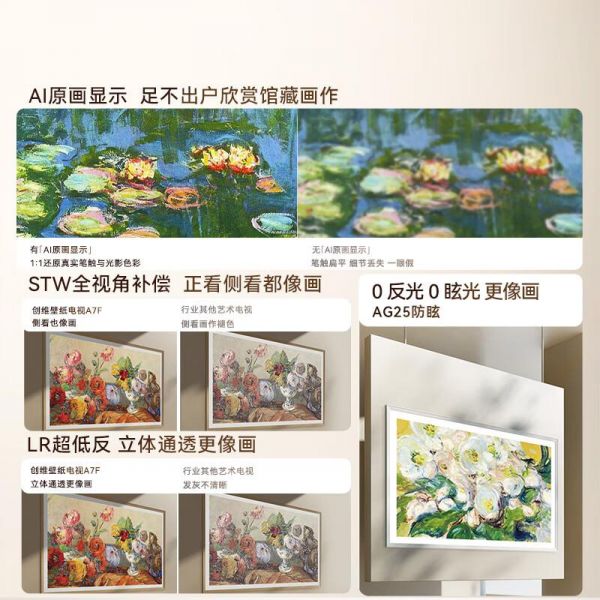 此外,艺术壁画设计让它不仅是一台电视,更是一件艺术品,无缝融入现代家居环境,提升整体美感。当电视处于待机状态,它依然能装点你的生活空间,展现独特的个性。